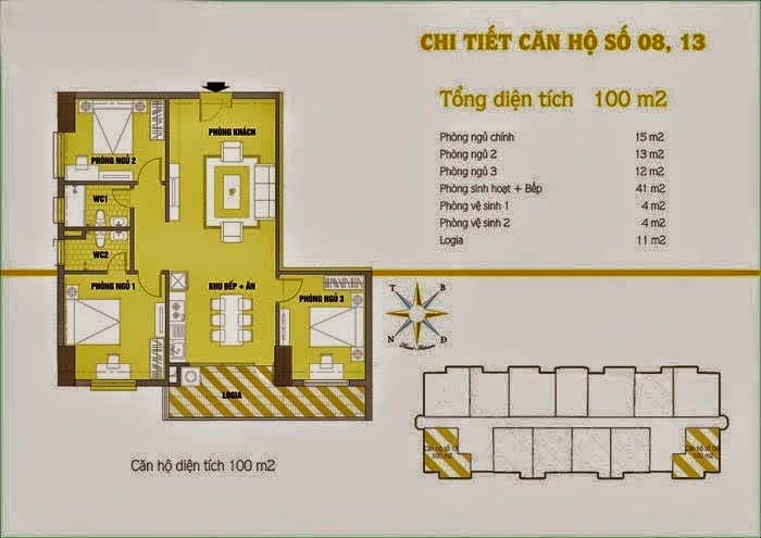 Căn hộ C: S= 100m2, gồm 2 căn: số 08 và 13, thiết kế gồm 3 phòng ngủ, 1 phòng khách và 2 phòng vệ sinh