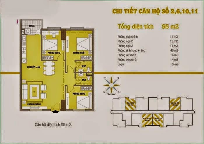 Căn hộ D: S= 95m2, gồm 6 căn: 02 và 06, 09,10, 11, 12, thiết kế gồm 3 phòng ngủ, 1 phòng khách và 2 phòng vệ sinh